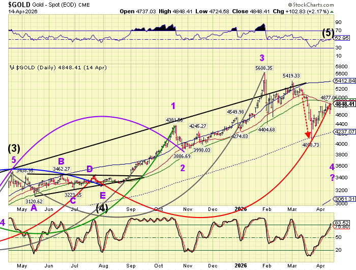 Gold may have completed its Master Cycle yesterday at 4857.82.  Today it is consolidating near the high, but may resume its decline shortly.  The decline may progress into the end of April with increasing trending strength.  Inflation may be increasing, but gold may not be the ideal hedge.