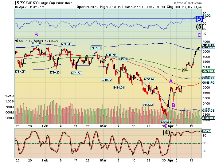 SPX futures rose to 7070.50 this morning, having met a primary Fibonacci relationship at 7060.00.  The Cycle Top is at 7095.00, so there is room to rise further in the Cycles Model.  SPX has entered the two-week turn window that allows a significant reversal, so we must stay on the alert.  The Model is organic and not mechanical, so it may follow guidelines that may be influenced by such things as war, weather or taxes.  All of those influencers may presently be at work.  Note that the January 28 high was a rogue Wave B high and not a Primary Cycle high.  This has fooled many, including myself, but it did not meet a Cycle imperative, that it must reach the Cycle Top resistance to end a Primary Cycle.  That is where we are presently.