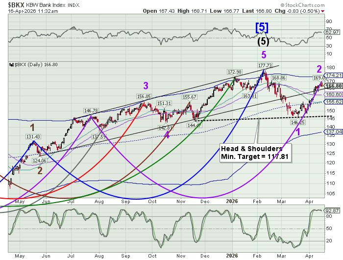 BKX is pulling away from its Master Cycle high made yesterday.  A sell signal may be obtained with a decline beneath its trendline at 165.00.  Liquidity is tightening as tax payments are being made to meet the IRS deadline.  While the illiquidity of private credit has been shuffled into the background, banks have been quietly reviewing their exposure to private credit, while downplaying the risks.