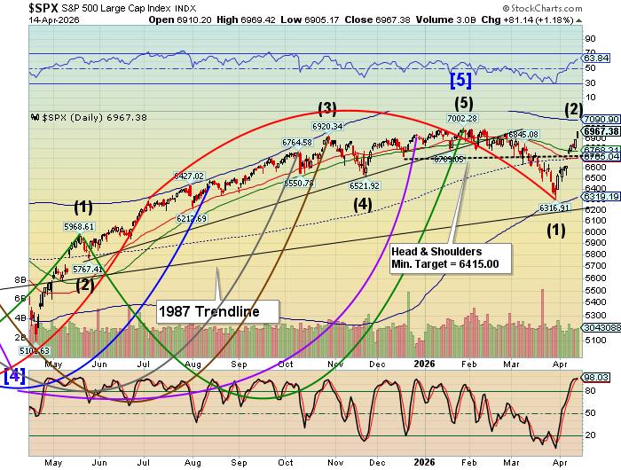 SPX futures rocketed higher to 6806.90 thus far, just as the bounce from the bottom was losing steam.  Hedge funds were adding shorts just in time for a massive squeeze while retail investors aggressively bought puts.   Of course, the catalyst was the fragile ceasefire in the Middle East.  The Cycles Model suggests the bounce may have another week before complications arise.  A “regular” Cyclical bounce might have risen to the mid-Cycle resistance at 6689.33 or the neckline at 6710.00.  But the focus of the bounce may have been the 52-day Moving Average at  6777.12, where Wall Street could declare victory over the bears.
