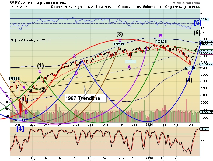 SPX futures rose to 7070.50 this morning, having met a primary Fibonacci relationship at 7060.00.  The Cycle Top is at 7095.00, so there is room to rise further in the Cycles Model.  SPX has entered the two-week turn window that allows a significant reversal, so we must stay on the alert.  The Model is organic and not mechanical, so it may follow guidelines that may be influenced by such things as war, weather or taxes.  All of those influencers may presently be at work.  Note that the January 28 high was a rogue Wave B high and not a Primary Cycle high.  This has fooled many, including myself, but it did not meet a Cycle imperative, that it must reach the Cycle Top resistance to end a Primary Cycle.  That is where we are presently.