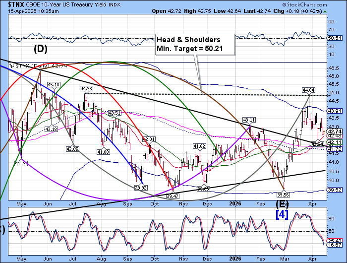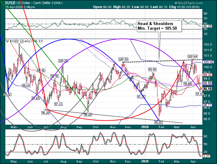 USD may be on its way to completing its Master Cycle low in the next few days.  Should that occur, the subsequent rally may take out the neckline of the Head & Shoulders formation.  The new Cycle has the USD trending higher until early June.