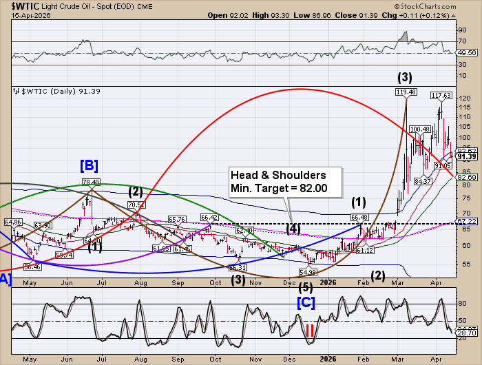 Crude oil declined to 87.08, then bounced to test its cycle Top resistance at 93.27 this morning.  The test failed, sending crude lower.  The next support level may be the 52-day Moving Average currently at 82.21 in time for a Master cycle low.  That may create a false flag, as crude oil may be trading higher by early next week.